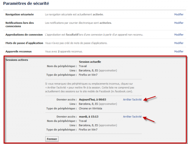 3 – Les sessions actives montrent les endroits où votre session Facebook est restée ouverte en précisant la date, le lieu, sur quel navigateur et sur quel système d’exploitation. Cliquer sur “Arrêter l’activité”