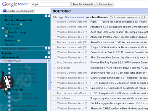 Google Reader, l’agrégateur de flux RSS de chez Google (comme son nom l’indique) y va lui aussi de son petit effet spécial. Taper le code dans l’interface fait apparaitre un petit ninja dans la liste des abonnements à gauche de la page.
