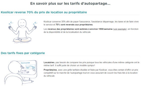 « Pour rendre votre voiture disponible : accrochez les clés dans la boite à gants, sortez du véhicule, verrouillez les portes avec votre badge Koolicar et répondez à notre SMS pour indiquer la durée de la disponibilité. Vous pouvez aussi planifier les disponibilités de votre voiture (disponible, indisponible, à la demande) à l’aide d’un calendrier en ligne sur votre espace personnel. Nos conducteurs pourront réserver et louer votre voiture sans qu’il soit nécessaire de les rencontrer. Vous êtes informé par sms dès que votre voiture est réservée », note le site Internet.