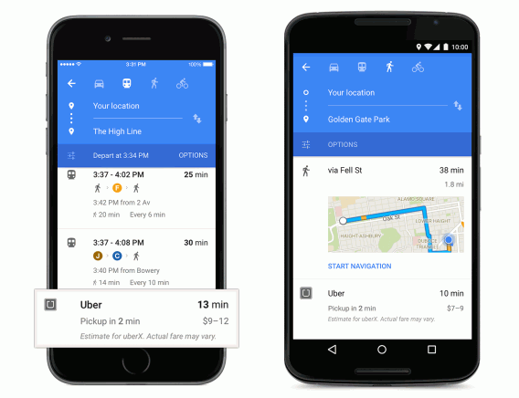 Il y a aussi un nouveau choix de transport en plus de la marche, les transports en commun, le vélo et la voiture. Uber est en effet maintenant intégré dans l’application, de sorte que vous pouvez planifier la réservation de votre taxi à l’intérieur de Google Maps. L’application vous donnera également un devis pour la course. Bien sûr, cette fonctionnalité ne fonctionne que dans les villes où Uber est disponible.