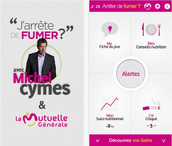 Cette application 100% française connait un véritable succès notamment dû à la notoriété médiatique du Docteur Michel Cymes. Ce dernier présente chaque jour une fiche conseil pour garder le moral, ne pas reprendre la cigarette et garder la ligne. Le bouton d’alerte permet d’accéder très vite à des distractions, comme des devinettes amusantes en vidéo (150 au total), des sudokus ou de la musique relaxante.