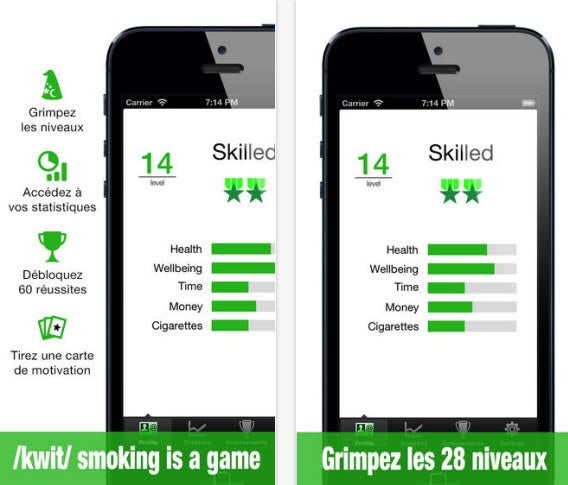 Conçue comme un jeu, elle a pour objectif d’augmenter votre participation et votre engagement dans l’arrêt du tabac en s’appuyant sur la prédisposition humaine à l’amusement. L’idée est donc de remporter des victoires pour monter de niveau et progresser dans les grades pour devenir le « Kwitter Ultime ».