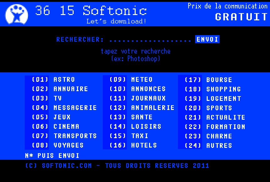 Softonic arrive sur Minitel! Après avoir testé les applications sur Windows, Mac, téléphones mobiles et applications en ligne, notre portail de téléchargement est fier de s’implanter sur la plus française des plateformes, à l’adresse 36 15 Softonic.