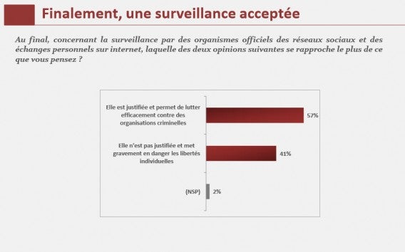 Selon le baromètre Orange-Terrafemina, 57% des français accepte la surveillance de leurs communications en ligne. 41% pense qu’elle n’est pas justifiée et met gravement en danger les libertés individuelles.