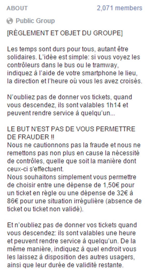 C’est ainsi qu’à Nice, le groupe Facebook Tram & Bus / Nice / Solidarité aux sans tickets soutient les navetteurs en leur donnant leur ticket toujours valable ou la position des contrôleurs. Avec ses 2.000 membres actifs, difficile d’être désormais contrôlé par surprise. Face à l’ampleur du phénomène, les pouvoirs publics ne savent plus que faire: «C’est un site de voleurs», lâche dans Nice-Matin Phillipe Pradal, le premier adjoint du maire de Nice, Christian Estrosi.