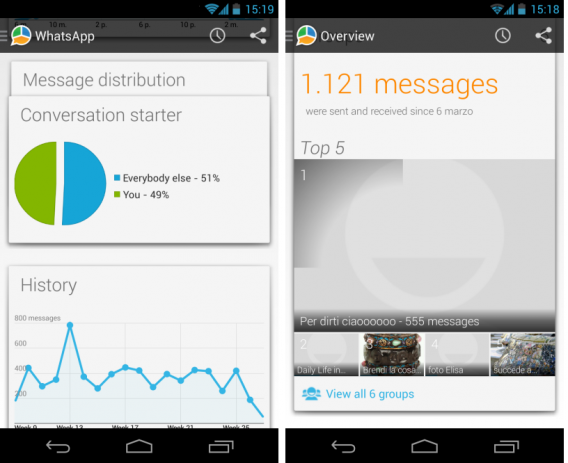 Si vous êtes accro à WhatsApp, WhatStat est essentiel puisqu’il compile toute sorte de statistiques curieuses : les personnes avec qui vous discutez le plus, quels jours et à quelle heure vous envoyez le plus de messages, la proportion de messages envoyés par rapport aux messages reçus, etc. WhatStat vous affiche des graphiques mensuels et hebdomadaires. L’application est indispensable pour savoir qui sont les personnes avec qui vous passez le plus de temps virtuellement. Pour les véritables accrocs à WhatsApp.