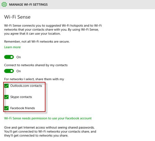 La sécurité de Wi-Fi Sense a ses limites: en activant le partage de votre réseau avec vos contacts, vous donnez les clés du routeur à tous les contacts d’Outlook.com, Skype ou Facebook qui peuvent avoir accès à votre réseau.