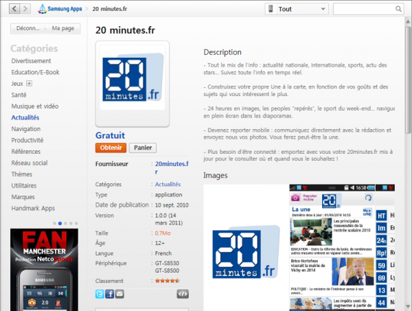 Sur la page de présentation d’une application, une description, des screenshots et les commentaires des utilisateurs sont disponibles pour vous faire idée avant acquisition (très utile en cas de doute pour ne pas regretter les quelques euros déboursés). Le prix est visible sous le logo de l’application ainsi que deux boutons: Acheter et Panier. Si l’application est gratuite, le bouton Acheter est remplacé par un bouton Obtenir.