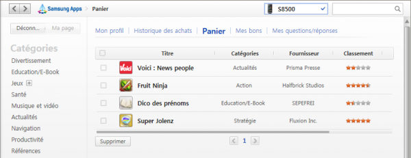 Quid du bouton Panier? Cette option est disponible sur la page personnelle de chaque utilisateur enregistré. Plusieurs onglets permettent notamment d’accéder à un historique des achats regroupant les applications achetées et les applications gratuites obtenues de la façon décrite précédemment. Elle permet tout simplement de garder un œil sur certaines applications que vous ne souhaitez pas installer tout de suite. Il s’agit en quelque sorte de marque-pages placés à l’envi pour retrouver plus facilement les programmes intéressants.