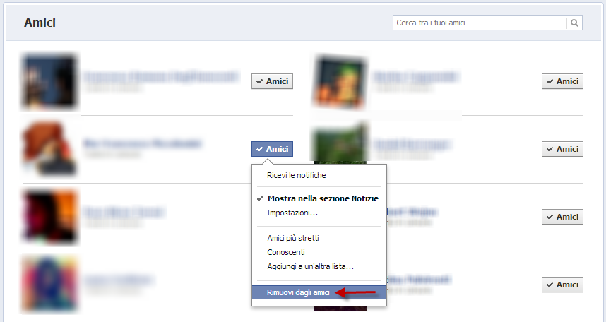 - Si aprirà un menu a tendina. Vai sull’ultima voce e clicca su Rimuovi dagli amici.