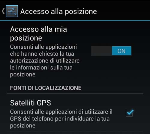Ovviamente, per poter utilizzare il GPS, il sistema deve essere integrato e attivato nel tuo smarphone. Per accenderlo, vai al menu delle impostazioni e controlla che Accesso alla posizione e l’opzione Satelliti GPS siano attivati.