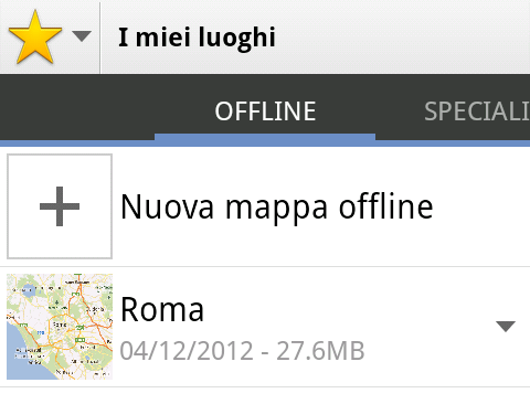 Per essere sicuro che la mappa si sia scaricata, vai su I miei luoghi e poi scorri verso sinistra per accedere a Offline. Nell’elenco dovresti adesso vedere la tua mappa salvata, come nell’immagine.