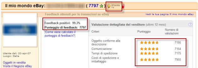Prima di procedere con l’acquisto, comunque, informati bene sul sito, leggendo i commenti di altri utenti che hanno comprato qualcosa e il feedback che hanno lasciato. Su eBay e Amazon, per esempio, il feedback lasciato dagli acquirenti ai venditori è molto importante e decreta il successo e l’affidabilità di questi ultimi: i venditori di cui ti puoi fidare ciecamente sono coloro che hanno il bollino Affidabilità Top (come nell’immagine in basso). Se i feedback non sono numerosi e positivi al 99% meglio diffidare!