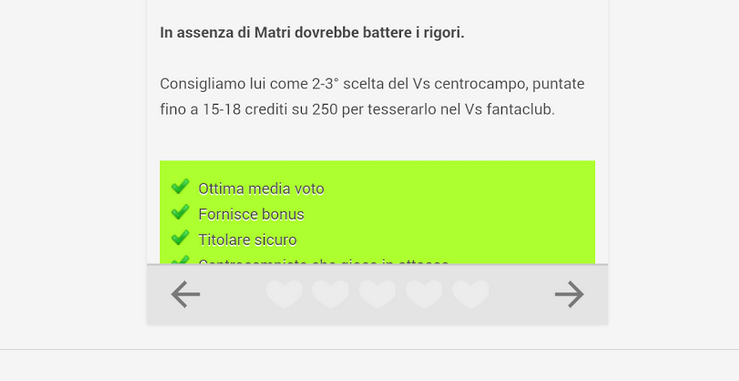 Ma la vera chicca sono le schede dei giocatori: Fantapazz ti consiglia dove collocare tatticamente il giocatore e stila un profilo con tanto di elenco dei vantaggi offerti dallo stesso. Soprattutto i pro e contro sono utilissimi per valutare il giocatore e, come se non bastasse, hai a disposizione la media voto, in casa e in trasferta, degli ultimi 3 anni del Corriere dello Sport e della Gazzetta.