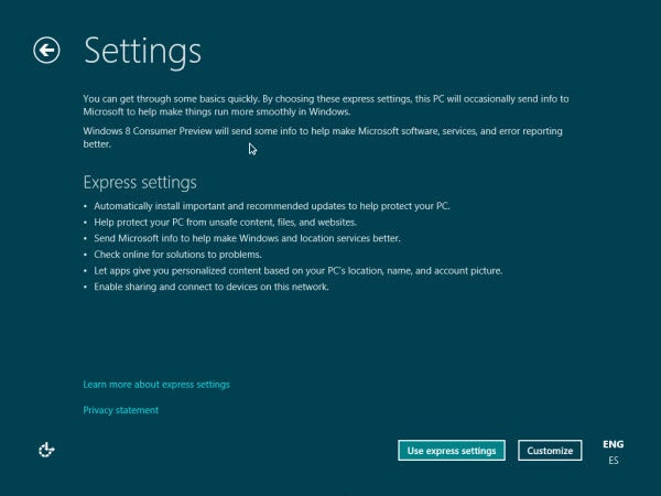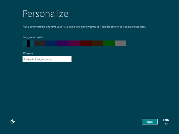 Scegli il colore dello sfondo e il nome del PC. Clicca su Next e poi su Use express settings: