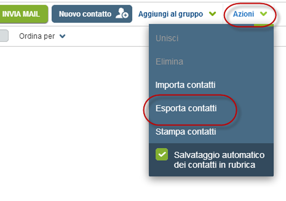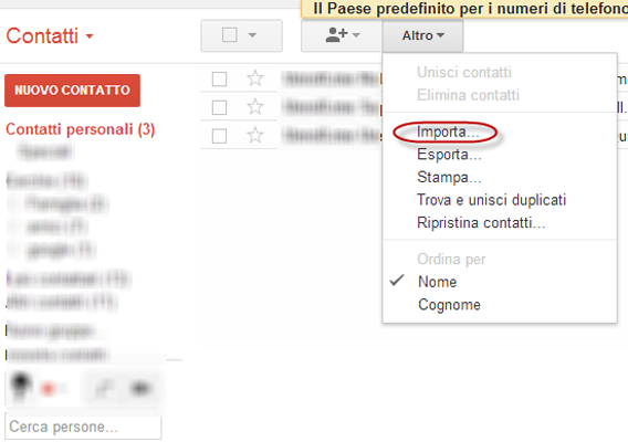 Quindi, sempre dalla sezione contatti, esporta l’archivio in formato CSV. Questo è il file che ti richiederà Gmail.
