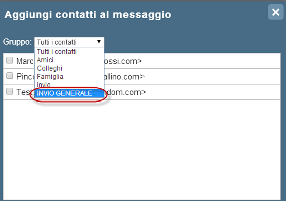 Seleziona tutti i contatti e inseriscili in un nuovo gruppo. Nell’immagine di esempio il gruppo è stato chiamato Invio Generale.