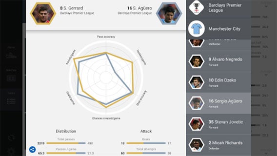 Il punto forte di Kick sta nel confronto tra due giocatori. Basta scegliere i due giocatori che ti interessano e l’app crea uno schema molto simile a quello che vedi in giochi come FIFA 15 o PES 2015. Un testa a testa in cui puoi confrontare Totti vs Pirlo per esempio. E dopo, puoi pubblicare il risultato su Facebook.