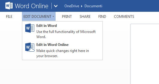 Ho creato un file Word, ho scritto per un po’ e poi l’ho lasciato in OneDrive. Il giorno dopo ho aperto il documento e dalla barra in alto ho scelto Modifica documento>Word: il file si è aperto con il programma del computer.