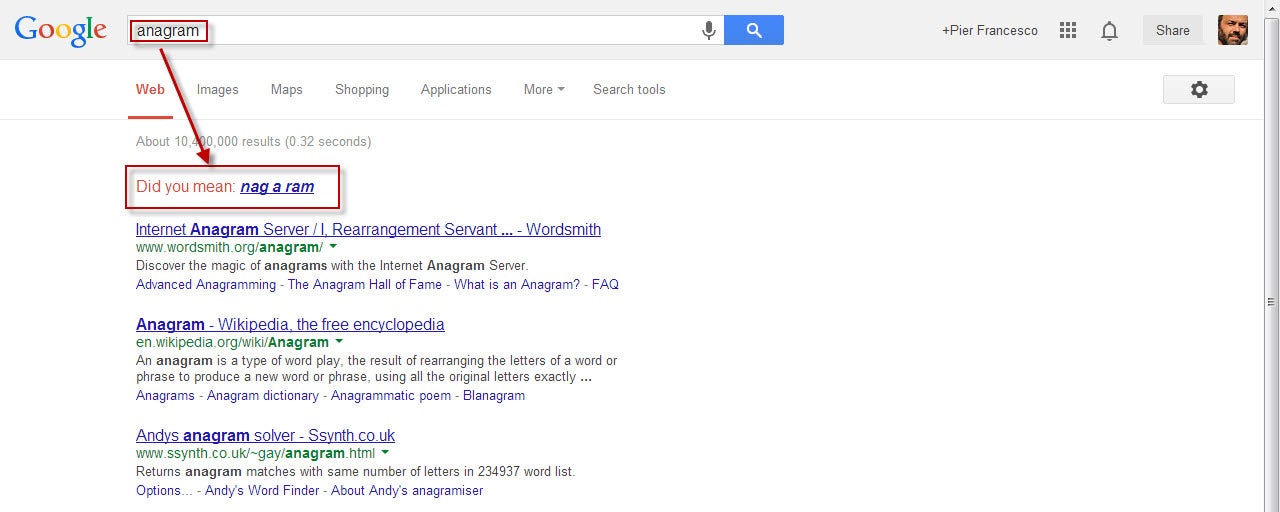 Se cerchi “anagram”, come suggerimento Google ti offrirà, be’… un anagramma della parola anagramma! Il suggerimento sarà adeguato alla lingua impostata.