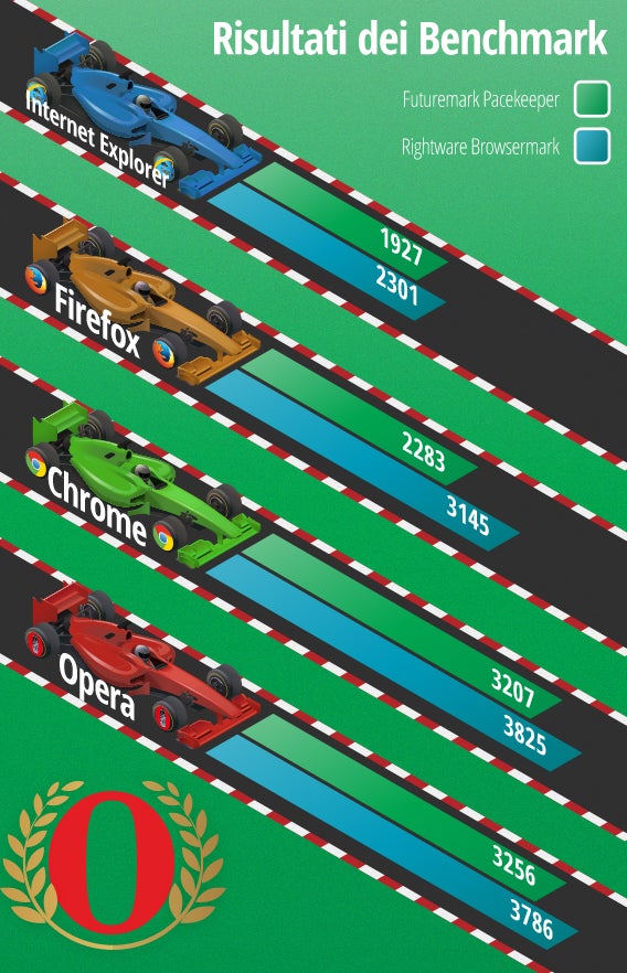 Qual è allora il miglior browser? Stando ai risultati della nostra comparativa, il miglior navigatore è Firefox, vincente in due prove su tre, come puoi vedere nella grafica.