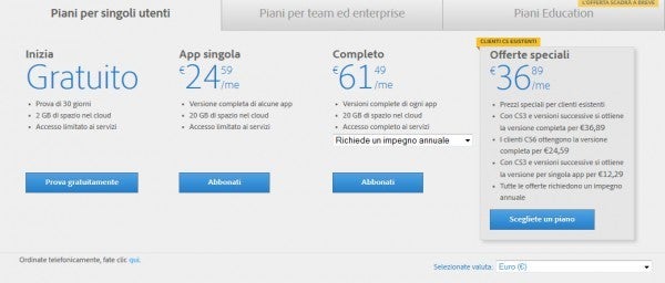 - Se possiedi una copia di CS3 o superiore puoi pagare mensilmente 12.29€ per un singolo programma e 36.89€ per tutta la suite se ti impegni per un anno (442.68 €).