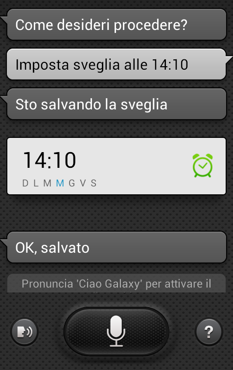 - Imposta Sveglia – Per impostare l’allarme mattutino pronuncia Imposta sveglia alle XX.XX (ora della sveglia) e voilà, l’allarme è impostato.