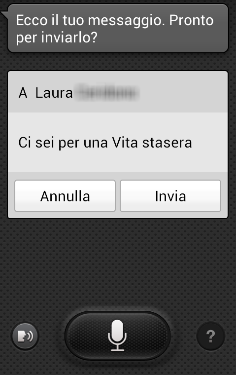 Seleziona il contatto e pronuncia il testo del messaggio. Contrariamente alla chiamata vocale, la risposta del software non è sempre precisa.