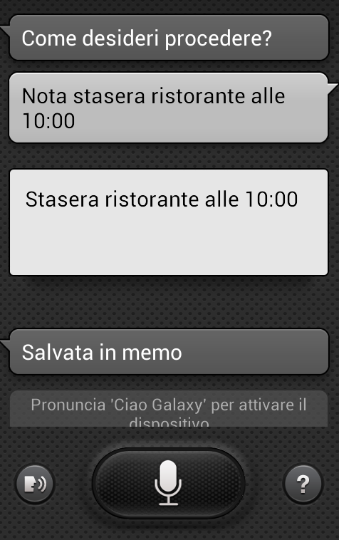 - Nuova nota – Puoi inserire una nuova nota o pianificare un nuovo evento pronunciando Nota XXX (testo da inserire). Buoni i risultati ottenuti scandendo bene le parole.