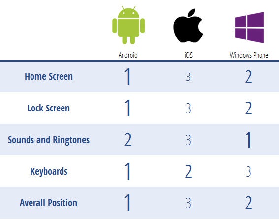 Come puoi vedere dalla tabella, Android è risultato il vincitore per aver surclassato gli altri OS in ben tre aspetti su quattro. Al secondo posto troviamo Windows Phone, in fondo iOS:
