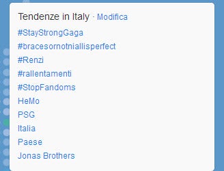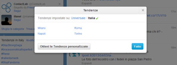 I trending topic sono degli argomenti di tendenza, cioè hashtag e parole ricorrenti nei tweet degli utenti. Concretamente, li trovi nella terza colonna di sinistra, sotto la voce Tendenze in Italy. Ogni treding topic è cliccabile, e ti porterà alla pagina con i tweet che includono quella keyword nel testo.