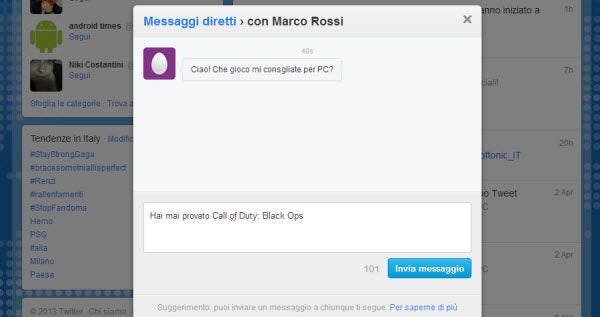 Il messaggio diretto è una funzione meno nota, sempre più occulta e poco usata di Twitter. Equivale a mandare un testo privato a un altro utente che ti sta seguendo, ma per comunicare in questo modo email e Facebook funzionano sicuramente meglio. A ogni modo, per mandare un messaggio privato devi cliccare sull’icona dell’ingranaggio in alto a destra e poi su Messaggi diretti. Premi quindi su Nuovo messaggio e scrivi.