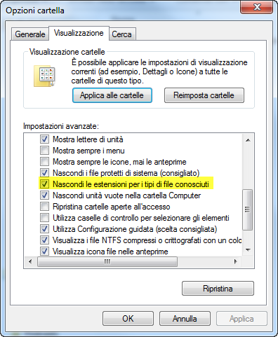 - Deselezionare l’opzione “Nascondi le estensioni …” nel menu Opzioni cartella dell’Esplora risorse (accessibile premendo Alt per qualsiasi cartella e aprendo il menu Strumenti).