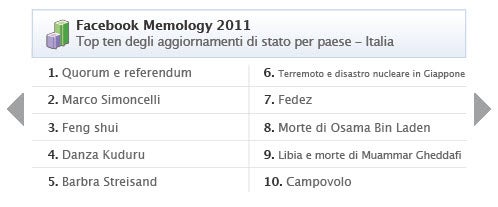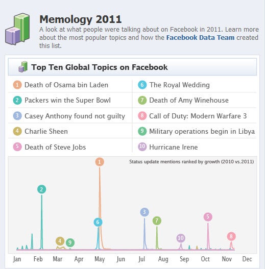 Anche Facebook non poteva essere da meno, e sulla propria pagina ha pubblicato il Memology 2011, una raccolta degli argomenti di cui più si è parlato sul social network, suddivisa per aggiornamenti di stato e paesi. Come per Twitter, il Royal Wedding e la morte di Steve Jobs sono stati tra gli argomenti più popolari a livello mondiale, mentre in Italia è Quorum e Referendum il leader della Top Ten.