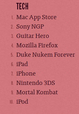 Nella sezione Tech, non possiamo far a meno di notare il Mac App Store in prima posizione, così come quello che si è rivelato uno dei videogiochi flop dell’anno e una storpiatura delle avventure del mitico duca: Duke Nukem Forever.