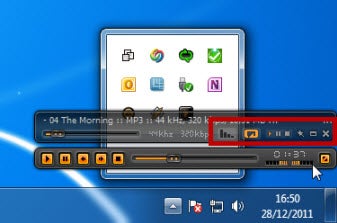 Je vindt de applicatie pas terug als je op het pijltje rechts onder in de taakbalk klikt. Hiermee haal je AIMP weer tevoorschijn, maar alleen als klein balkje. De knopjes op dit mini-menuutje zijn echter niet duidelijk. Hierdoor moet ik elke keer weer raden met welke knop ik het menu kan maximaliseren tot de normale grootte.
