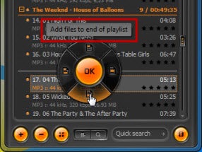 Bovendien is het programma gebruiksvriendelijk tijdens het toevoegen van een nieuwe map met mp3’tjes. Wanneer je deze de playlist in sleept, verschijnt er een knop die je laat kiezen wáár je het album wilt invoegen. Zo druk je bijvoorbeeld op het onderste knopje om de mp3’s op het einde van de afspeellijst te zetten.