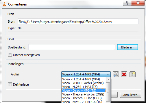 Met VLC media player converteer je ook video- en audiobestanden. Het ondersteunt populaire formaten als mp4, Webm, TS, OGG, ASF, mp3 en FLAC. Wederom ga je eerst naar Media om daarna op Converteren/opslaan te klikken. Daar kies je het bestand en drukt de knop Converteren / Opslaan. Nu krijg je een menuutje waar je het formaat en de doelmap kiest: een kind kan de was doen.