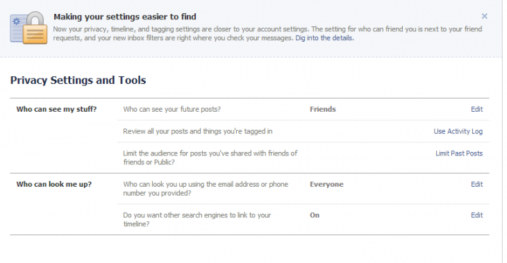 Facebook voerde onlangs nieuwe privacyinstellingen in en deze worden beter zichtbaar bij de nieuwe tijdlijn. Ten eerste is je relatiestatus verwijdert uit de info die bezoekers op jouw pagina zien. Daarnaast is het eenvoudiger om je beveiliging aan te passen. Je privacyinstellingen staan nu naast elkaar in een duidelijk overzicht zodat je niet meer zelf op zoek hoeft.