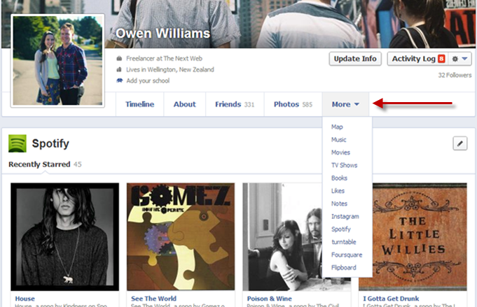 Bij de tab More heb je de keuze om je Spotify, Instagram, Flipboard of Foursquare account aan je Facebook profiel te koppelen. Zo zien je vrienden gelijk jouw nieuwste kiekjes, je favoriete playlist of waar je incheckt.