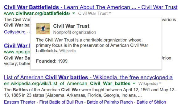 Er verschijnt echter pas additionele informatie naast de gewone zoekresultaten als het onderwerp online vaak besproken wordt. Google verzamelt gegevens over deze onderwerpen, zoals bijvoorbeeld de Amerikaanse Burgeroorlog, en biedt een klein schematisch overzicht. Gebruikers worden zo beter geïnformeerd voordat zij op een link klikken.