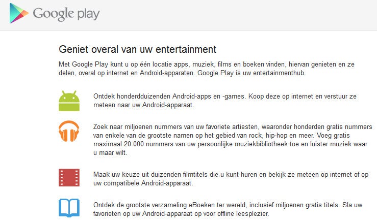 Een tijdje terug veranderde de naam van Android Market in Google Play. Verder was er echter weinig aan te hand, totdat we ineens een Nederlandse beschrijving voor nieuwe diensten vonden. Deze zie je wanneer je naar Google Play gaat en een app ophaalt zonder ingelogd te zijn.