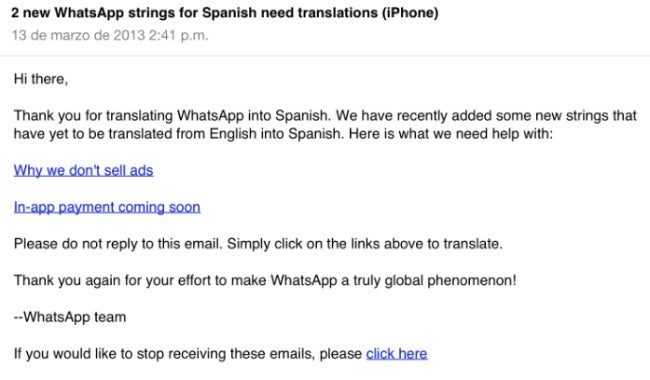 Een aantal WhatsApp-gebruikers die zich hebben opgegeven voor het vertalen van informatie in de app kregen het bericht dat zij de Engelse zinsnede ‘in-app payment coming soon’ moeten omzetten in het Spaans. Tot nu toe betaalden iOS-gebruikers eenmalig 0,89 euro bij de aanschaf uit de App Store. In navolging van WhatsApp voor Android lijkt dit nu te veranderen.