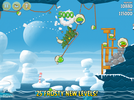 - 25 nieuwe levels vol ijs, feestelijkheden en plezier en 4 bonuslevels. Je lanceert de Angry Birds in de ijzige lucht en onder bevroren water voor verrassingsaanvallen.
