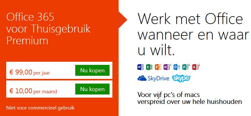 Het voordeel van Office 365 is dat je de licentie gebruikt op 5 (!) verschillende apparaten. Ook krijgt je online opslag van 20 GB via Microsoft SkyDrive, zodat je overal en altijd toegang hebt tot je bestanden en documenten.
