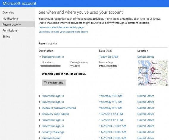 Onder het tabblad “Recente activiteit” is te zien waar en wanneer er is geprobeerd in te loggen, zodat je zeker weet dat jij de enige bent die jouw account gebruikt. Microsoft voegt zelfs een Bing-kaart toe om de inlog-locatie aan te geven.