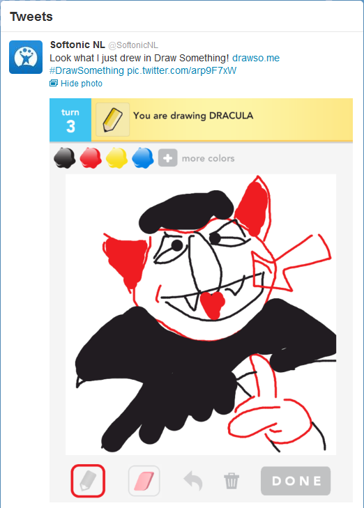 Mijn favoriete toevoeging in deze nieuwe versie van Draw Something is het delen en opslaan van je tekening. Een ongetalenteerde kluns als ik, maakt waarschijnlijk slechts 1 mooie tekening in zijn gehele Draw Something-carrière en het zou zonde zijn om die te verliezen. Met de nieuwe functie sla je de tekening op in je fotogalerij of stuur je jouw meesterwerk over het wereldwijde web naar je Twittervolgers of Facebookvrienden. Let wel, het delen van je tekening is voorlopig alleen voor iPhone en iPad maar zal ook zeer binnenkort beschikbaar zijn voor Androidkunstenaars.