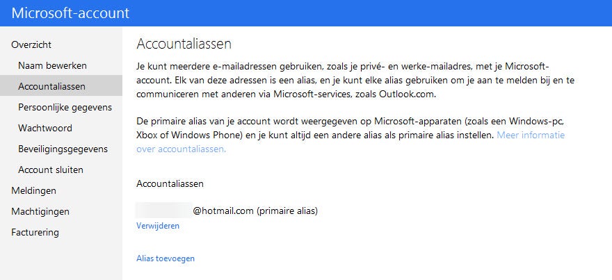 Om je aliassen te beheren ga je naar https://account.live.com/ en klik je op “Accountinstellingen“. Volg hier de instructies op onder “Accountaliassen” en switch, verwijder of verifieer jouw aliassen.