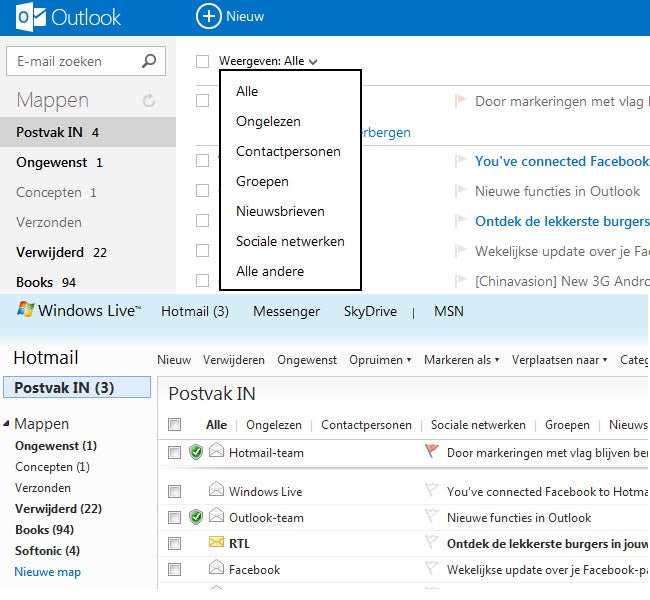 Hoewel het uiterlijk flink is veranderd, blijven de meeste functies gelijk. Wat is verdwenen is het startscherm waarin je sociale activiteiten van Twitter, LinkedIn of Messenger zag en kon kiezen voor 5 aparte menu’s. Vanuit dit scherm ging je bijvoorbeeld naar je Postvak, agenda of contactpersonen. Op Outlook.com heb je meteen een overzicht van je berichten en klik je op het menu naast Outlook (het pijltje linksboven in het scherm) om een nieuw menu te openen. Het nieuwe scherm oogt netter en transformeert Outlook tot web-app in plaats van website.