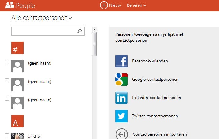 Beheer van contactpersonen – en de koppeling van deze aan sociale netwerken – is sterk verbeterd. Vanuit een helder menu voeg je diverse netwerken toe, waaronder Facebook, LinkedIn en Twitter. Koppel je de sociale netwerken aan Outlook, dan chat je vanaf de website zoals je vanuit deze netwerken gewend bent. Personen uit de netwerken worden automatisch toegevoegd en klik je op het tekstballonnetje rechtsboven in het scherm dan kan je meteen berichten sturen.